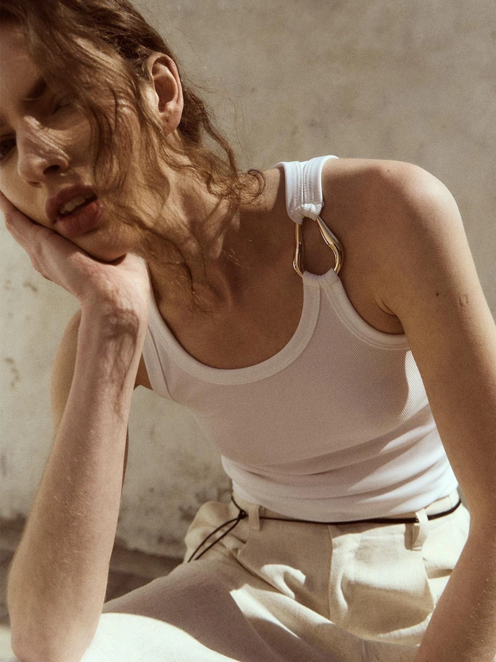 Top básico con argolla en la tira.La modelo lleva un talle S en blanco. TELA: MICROMORLEY
