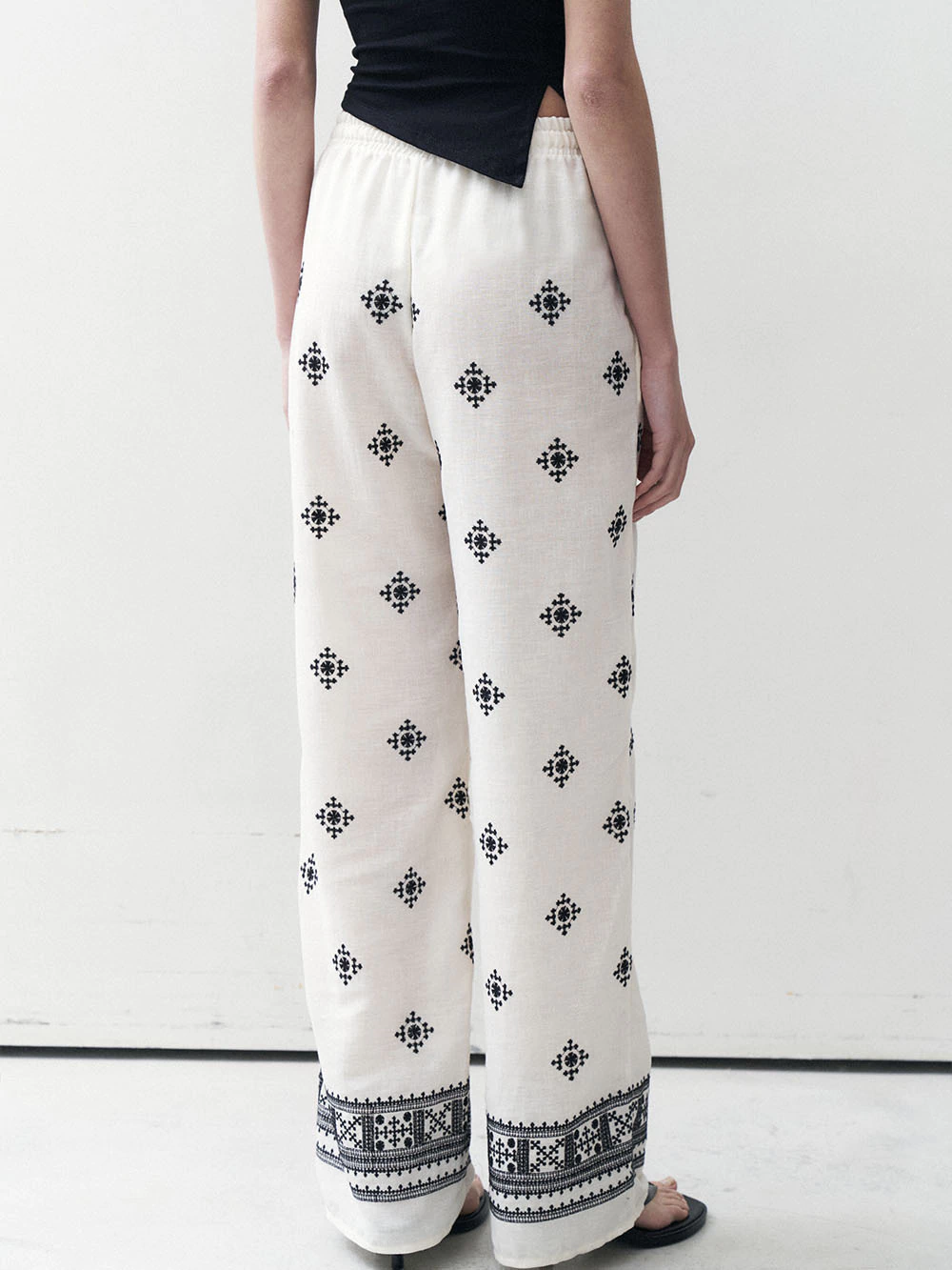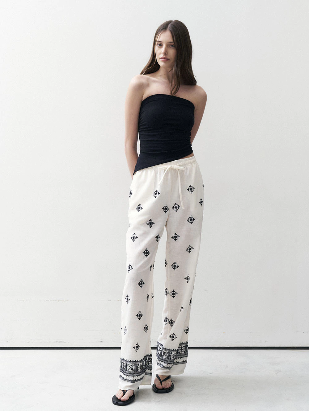 Wide leg con bolsillos en los costados y una tira para atar que pasa por el interior de toda la cintura. La modelo lleva un talle S en crema. TELA: LINO BORDADO CON GUARDA