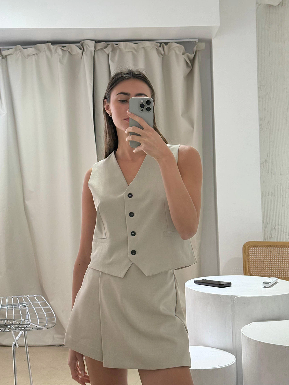 Skort con sobrefalda inclinada. Bolsillo ojal no funcional. Elástico en la espalda con formato short. Cierre lateral con cremallera oculta en costura.
