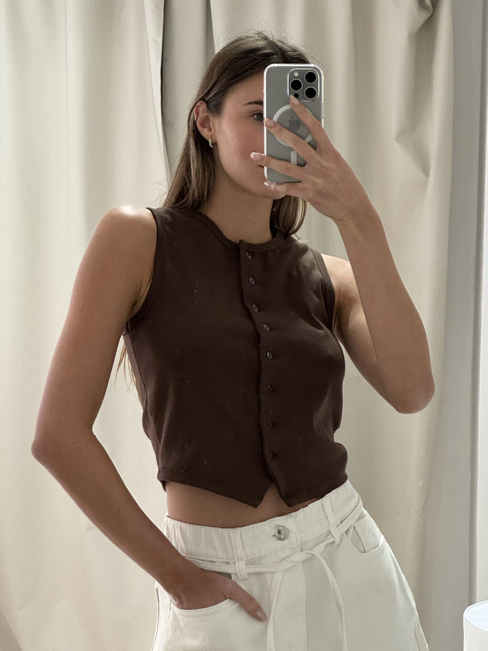 Musculosa con cuello redondo y cierre frontal con botones a tono.