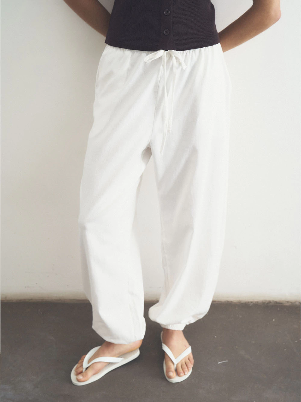 Pantalón balloon de tiro medio. Bolsillos en los costados y en la espalda. Tira del mismo material y elástico en toda la cintura poder ajustar. Bajo acabado abullonado con elástico interior..